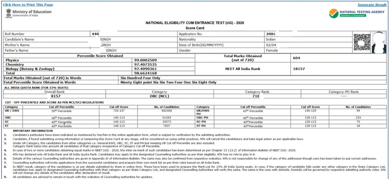 NEET Result Check Here Score Card 2020 Available On 16 October at Before 4:00 PM यहाँ